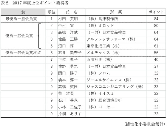 この原則を2017年度について適用した結果、上位6名(表2)を例会で順次表彰する事となりました。