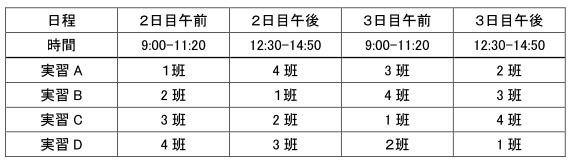 4班に分かれ、以下の4種類の実習(各140分)を2日間で受講します。