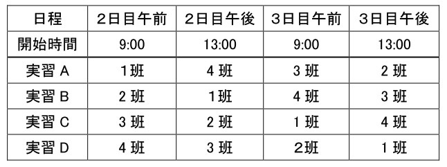 受講者は4班に分かれ、以下の4種類の実習(各90分)を2日間で受講します。