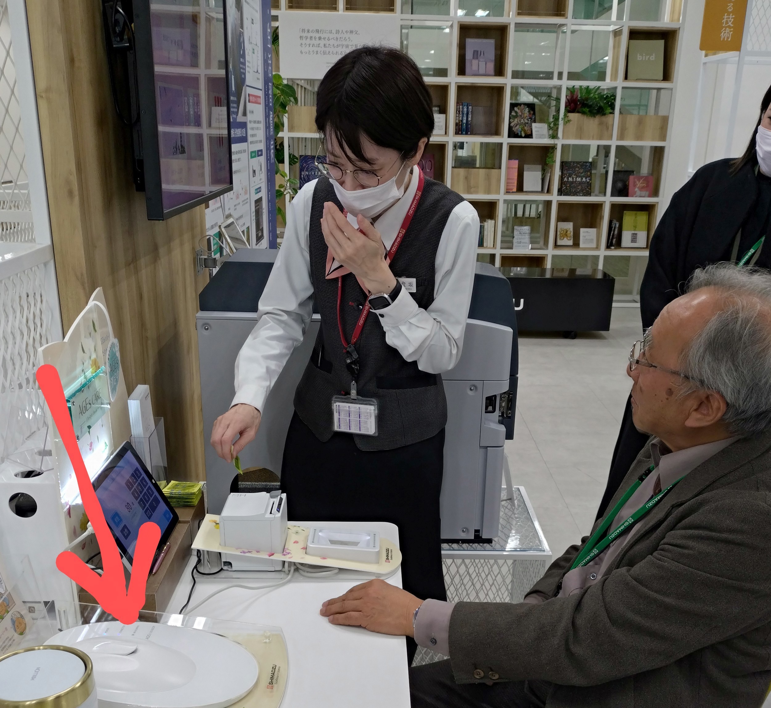 (左下矢印の装置、指を挟んで測定)のデモを受けられる中村委員長