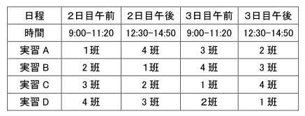 4班に分かれ、以下の4種類の実習(各140分)を2日間で受講します。