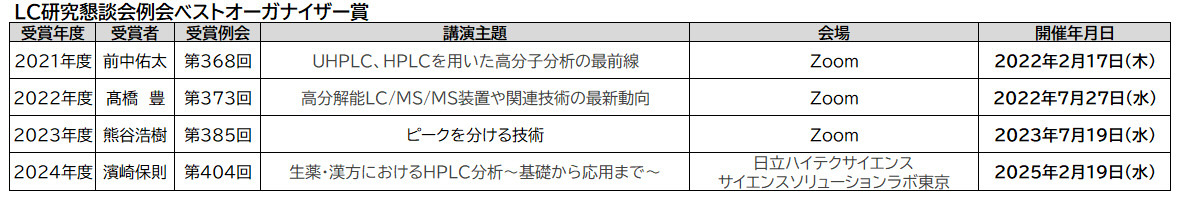 LC研究懇談会は、8月を除く毎月(9月は日本分析化学会年会会期中を含めて2回)、年間12回の研究懇談会(所謂例会)を開催しております。その中で、企画の斬新さ、参加者数等を加味して、最も優れた例会を実現したオーガナイザーにベストオーガナイザー賞を授与しております。2021年度最後の運営委員会で協議した結果、2021年度(2021年3月1日~2022年2月28日)のベストオーガナイザー賞を下記に決定致しましたので、お知らせ致します。なお、第28回LC & LC/MSテクノプラザ(2023年1月開催予定)で受賞者を表彰し、副賞を授与します。