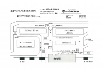 JR熱海駅改札(1箇所)を出て駅前にある、「ホテルニューさがみやバス乗り場」3番、4番、5番(案内図参照)から12時20分、12時40分に出発(定員29名ですので、できるだけ12時20分のバスにお乗り下さい)。